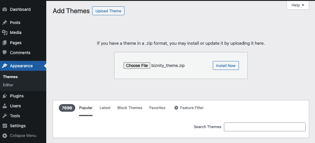 Step 6 - Then simply upload the newest “biznity_theme.zip” file in the Appearance → Themes section. Click on the Install Themes tab at the top and choose to upload the zip file. You have this step explained in section: Theme Installation via WordPress.