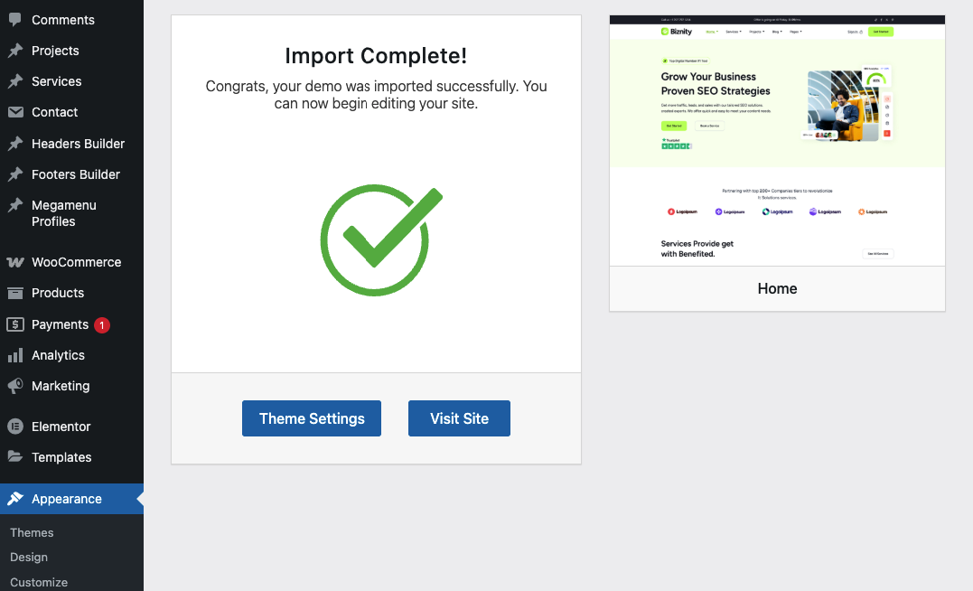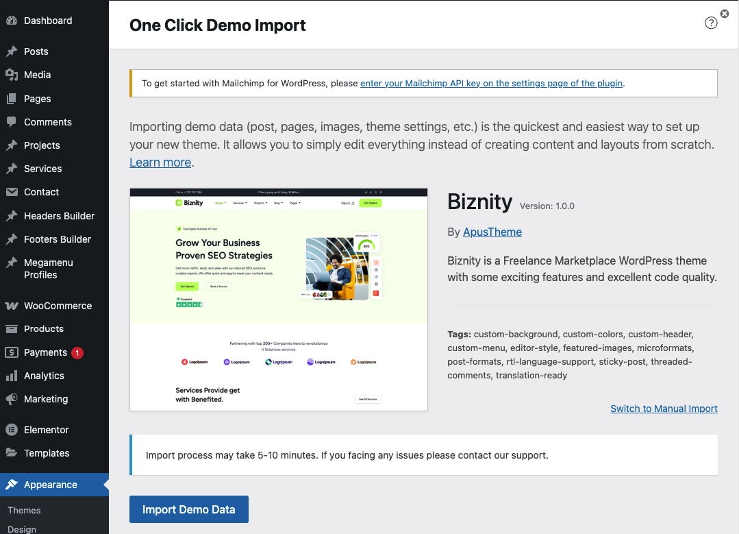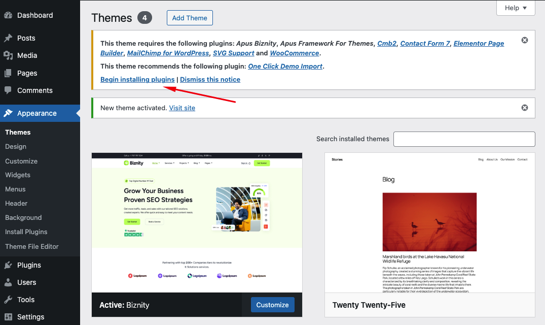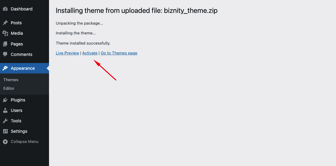Step 4 - Log into your WordPress Dasrdoard, go to Appearance → Themes and activate the new biznity theme.