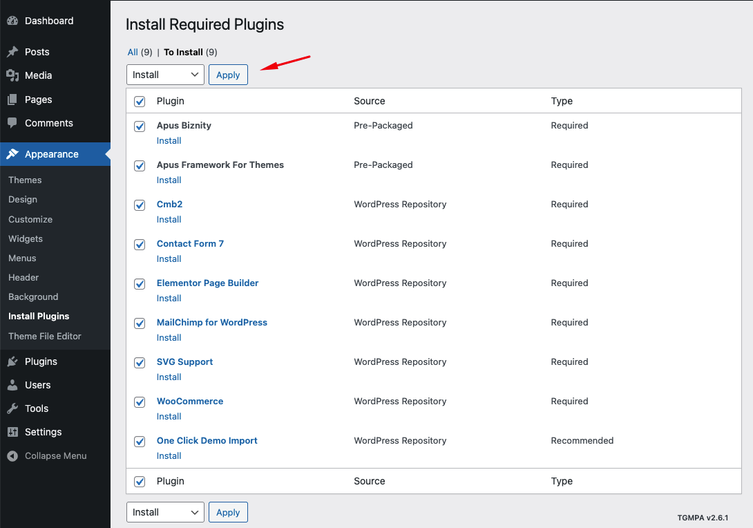 Step 2: Select all plugins then choose Install , Click Apply to install all plugins