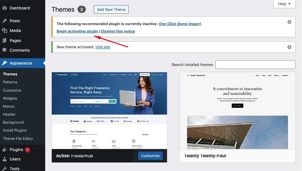 Step 4 - Log into your WordPress Dasrdoard, go to Appearance → Themes and activate the new freelanhub theme.