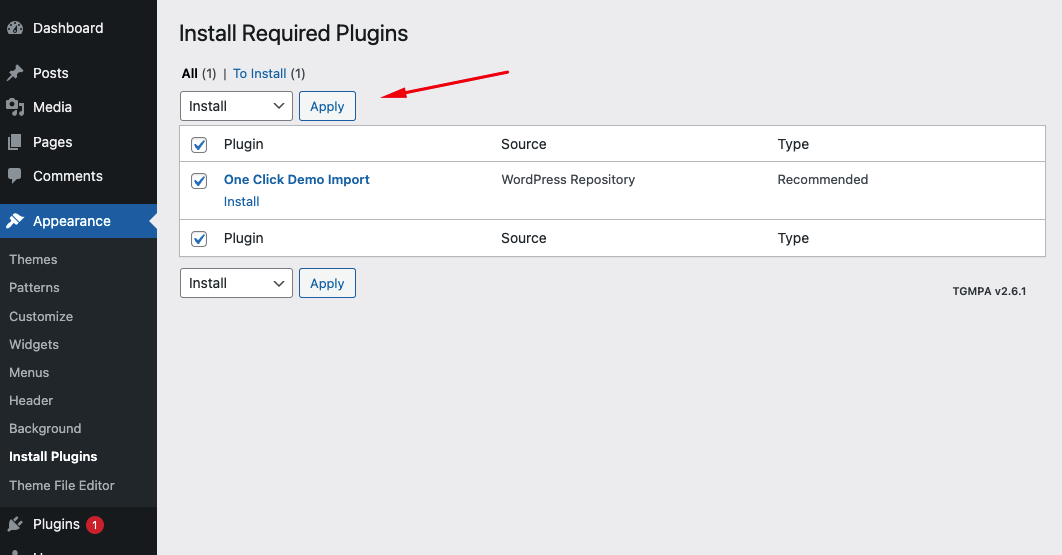 Right after the theme was activated, a notification at the top of the screen will suggest to continue with the installation of the plugins recommended for getting the best our of your theme.