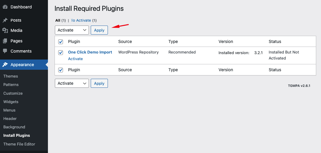 Step 3: After Installing all Plugins, select Activate then click Apply to active all plugins.