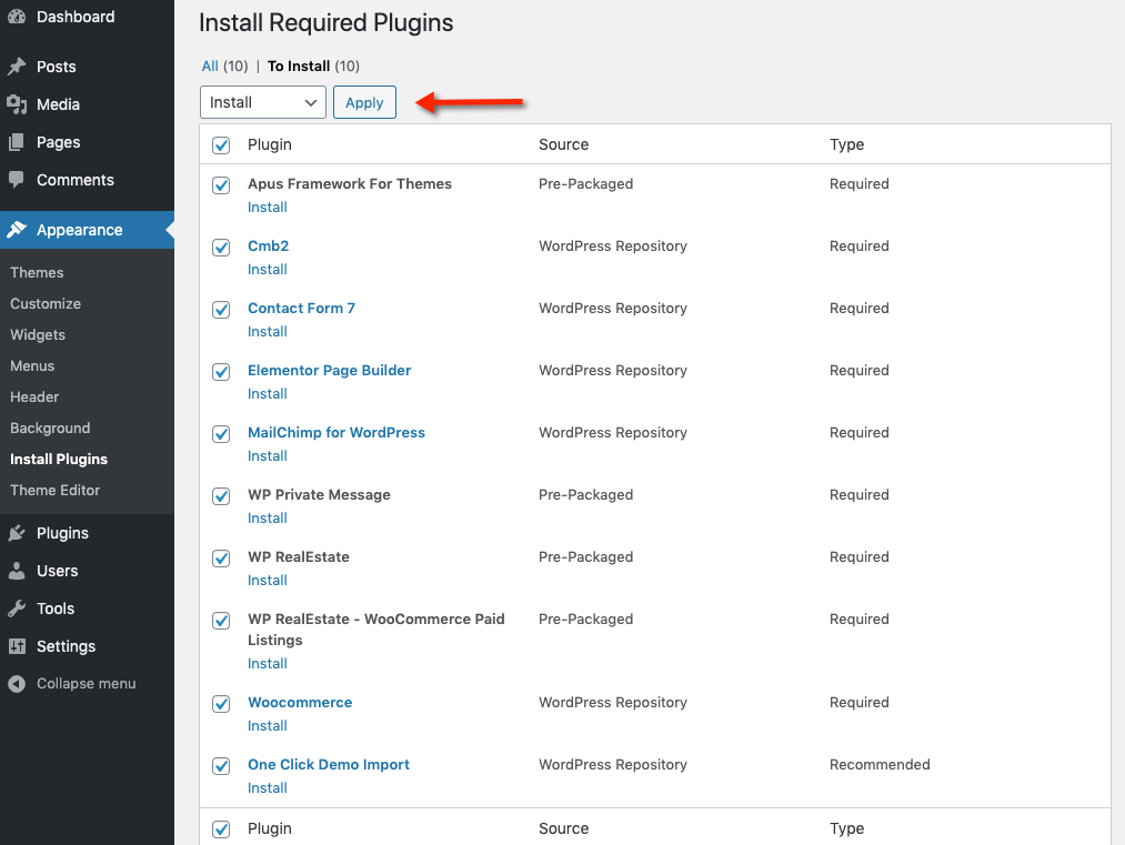 Step 2: Select all plugins then choose Install , Click Apply to install all plugins