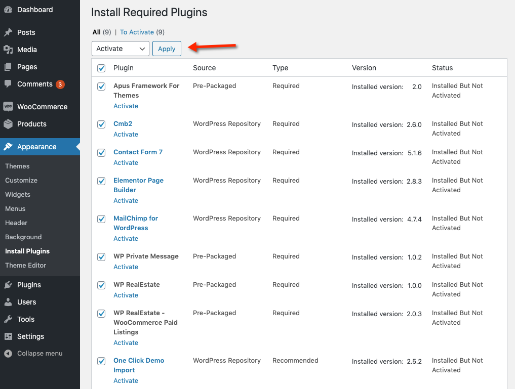 Step 3: After Installing all Plugins, select Activate then click Apply to active all plugins.