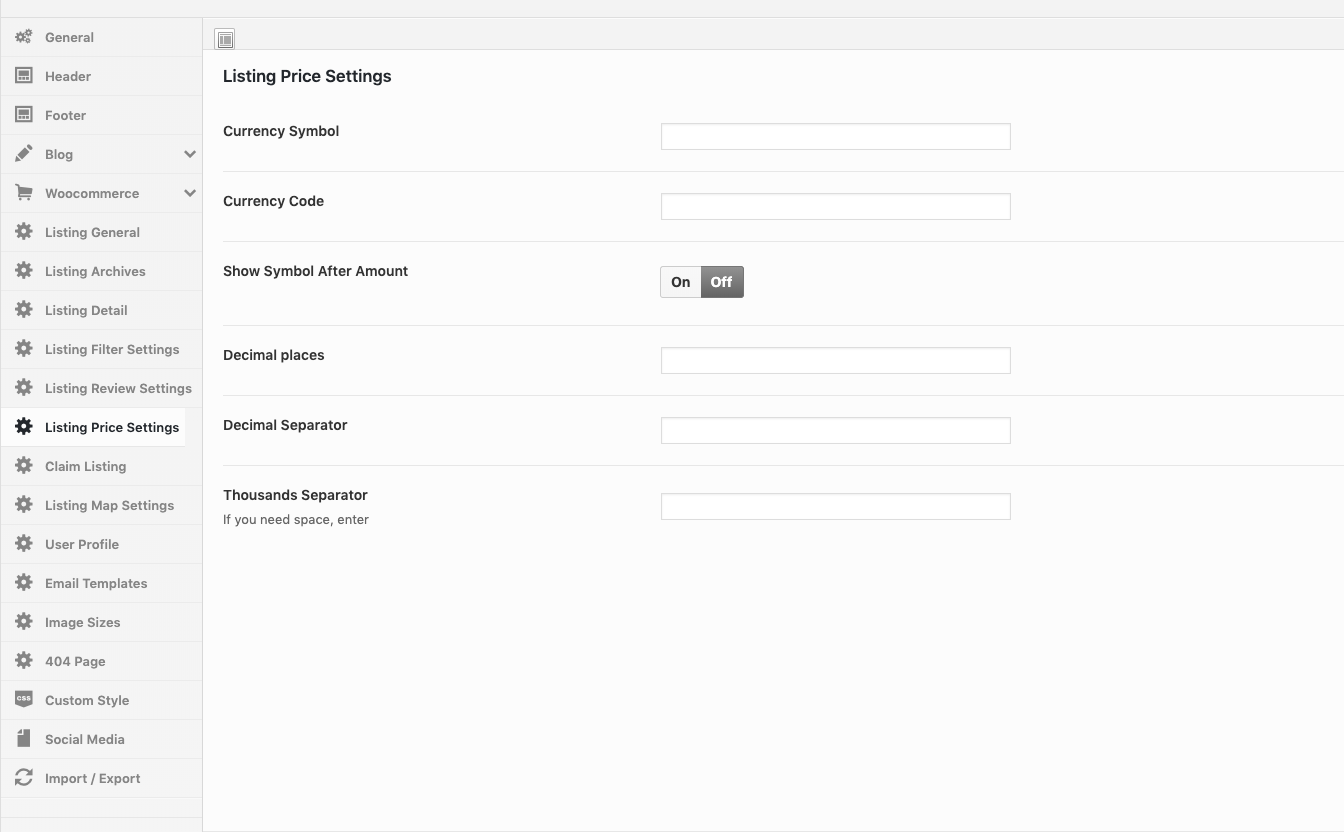 Go to WordPress admin panel and navigate to Theme Options → Listing Price Settings