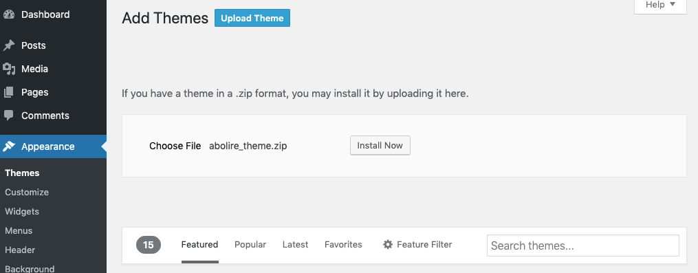 Step 6 - Then simply upload the newest “nerf_theme.zip” file in the Appearance → Themes section. Click on the Install Themes tab at the top and choose to upload the zip file. You have this step explained in section: Theme Installation via WordPress.