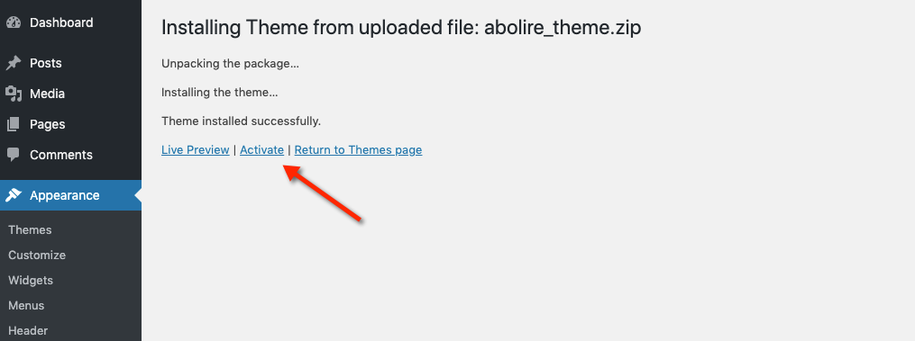 - Step 4: Wait while the theme is uploaded and installed then activate the theme.