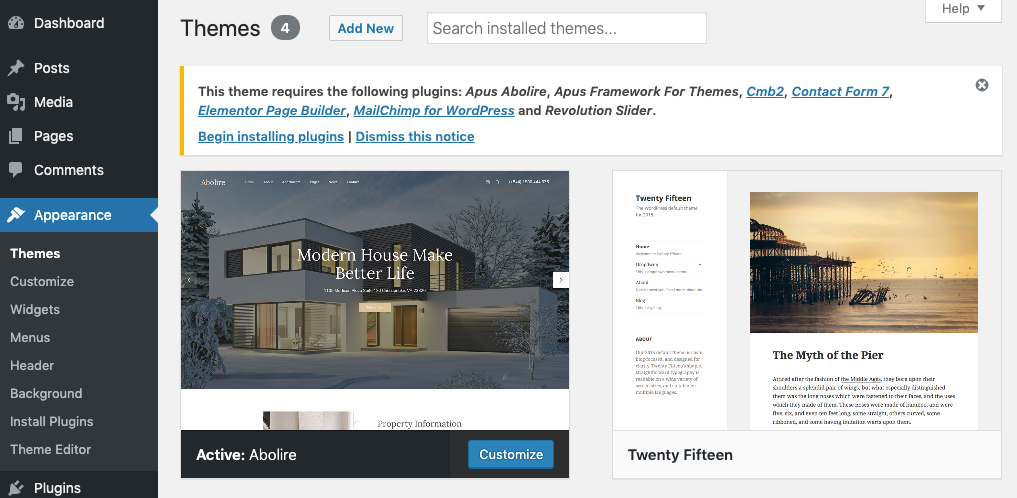 Right after the theme was activated, a notification at the top of the screen will suggest to continue with the installation of the plugins recommended for getting the best our of your theme.