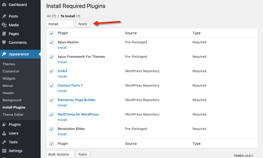 Step 2: Select all plugins then choose Install , Click Apply to install all plugins
