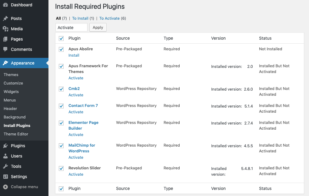 Step 3: After Installing all Plugins, select Activate then click Apply to active all plugins.