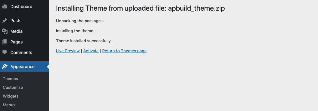 - Step 4: Wait while the theme is uploaded and installed then activate the theme.
