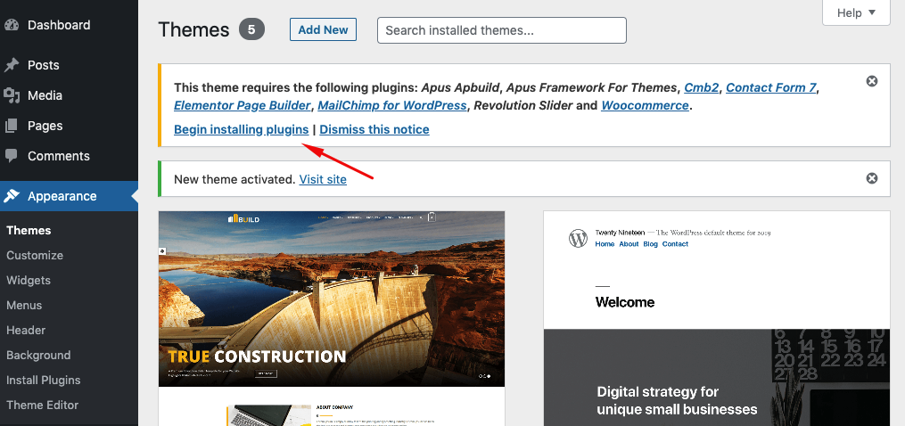 Right after the theme was activated, a notification at the top of the screen will suggest to continue with the installation of the plugins recommended for getting the best our of your theme.