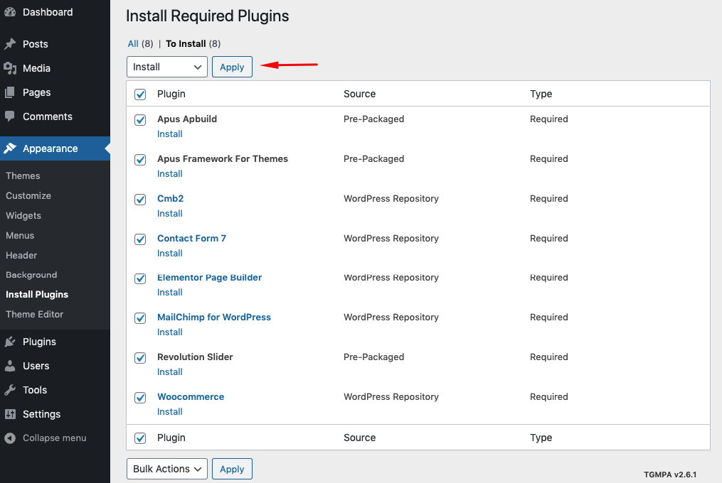 Step 2: Select all plugins then choose Install , Click Apply to install all plugins