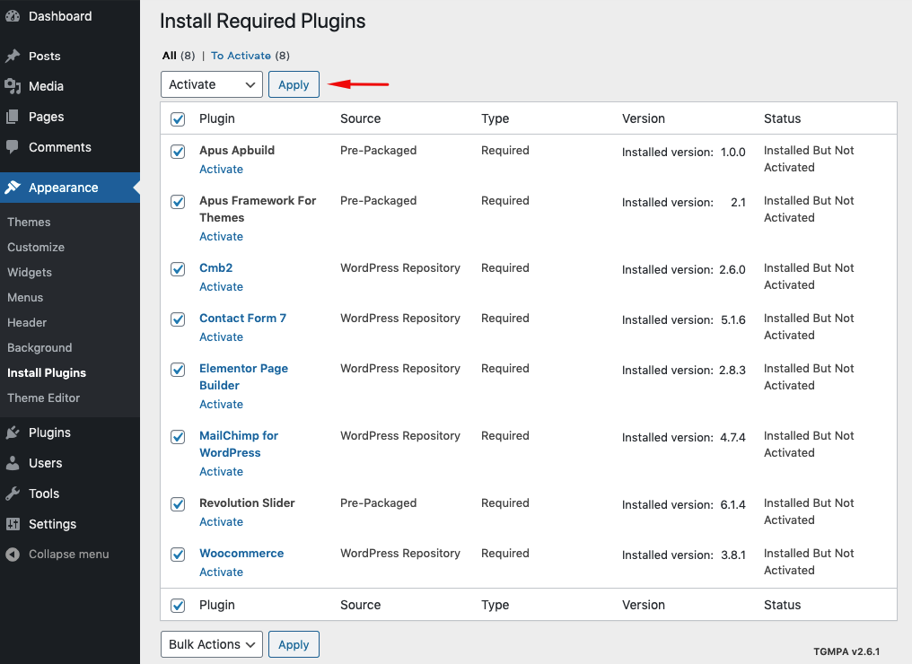 Step 3: After Installing all Plugins, select Activate then click Apply to active all plugins.