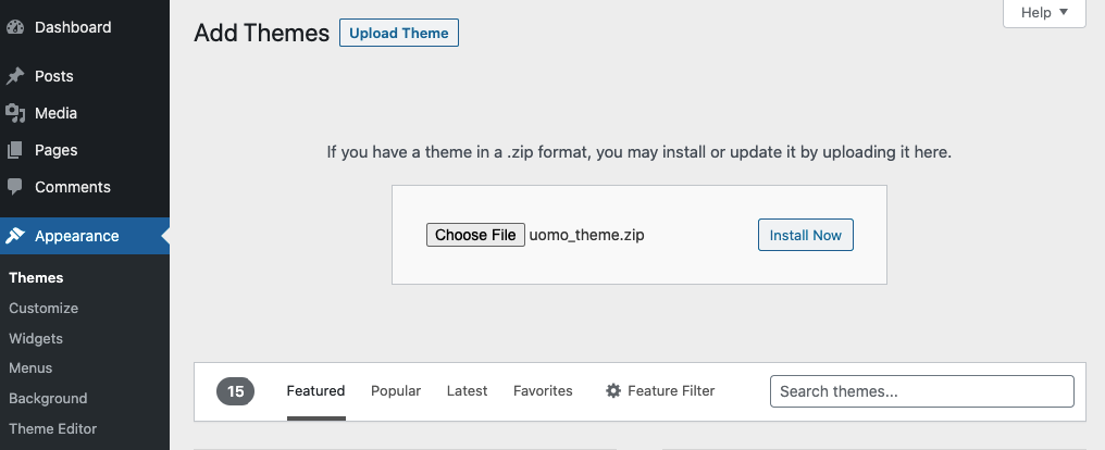 Step 6 - Then simply upload the newest “uomo_theme.zip” file in the Appearance → Themes section. Click on the Install Themes tab at the top and choose to upload the zip file. You have this step explained in section: Theme Installation via WordPress.