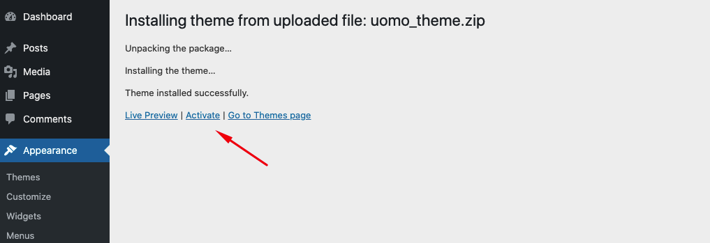 - Step 4: Wait while the theme is uploaded and installed then activate the theme.
