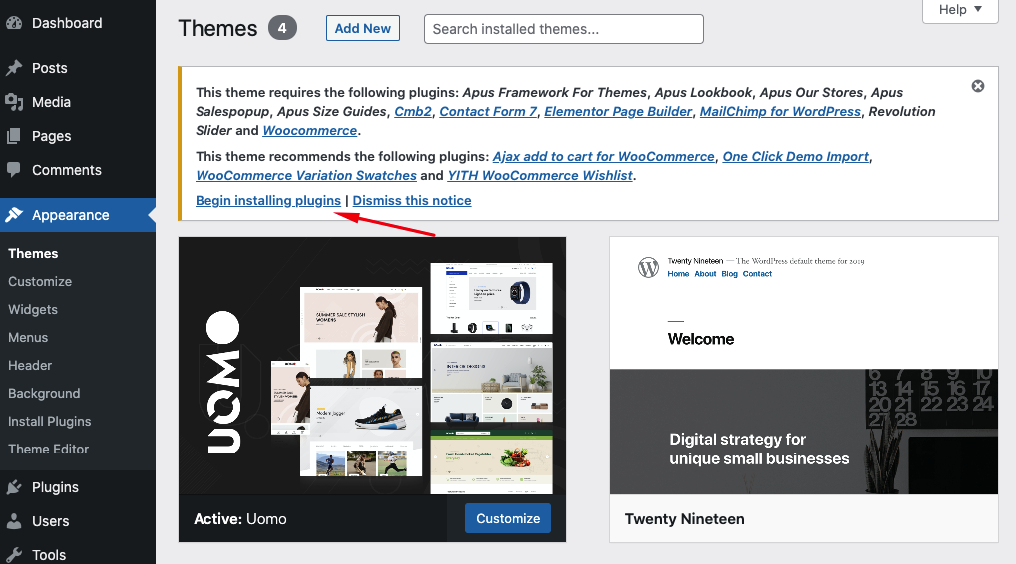 Right after the theme was activated, a notification at the top of the screen will suggest to continue with the installation of the plugins recommended for getting the best our of your theme.